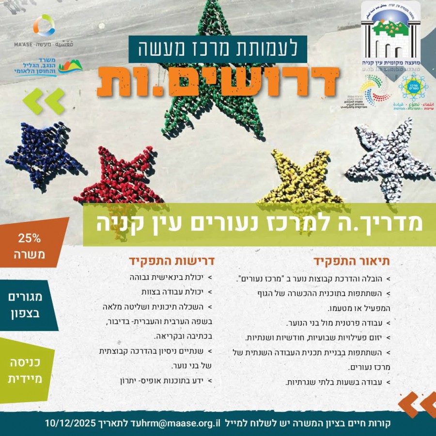 نعلن عن فتح باب الترشّح لوظيفتين لإقامة مركز شبيبة عين قنية מרכז ניעורים עין קניה: